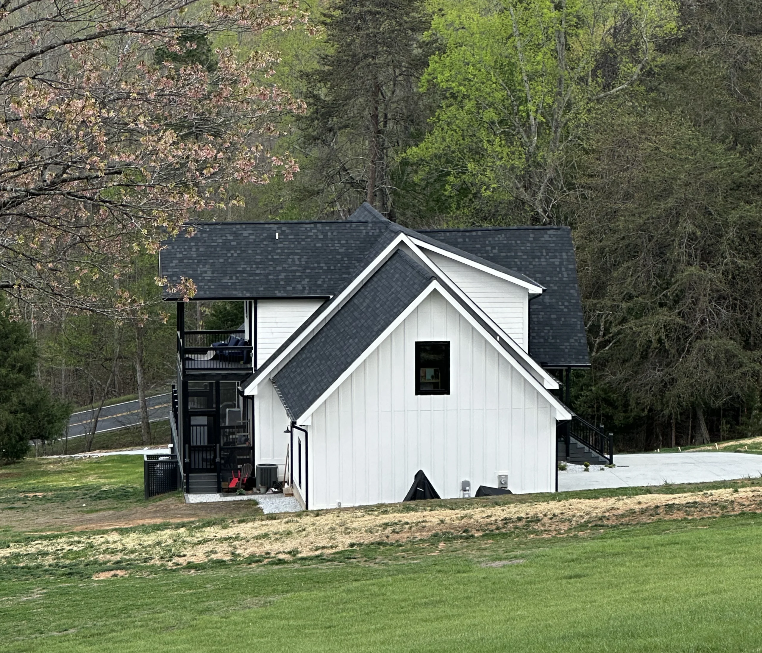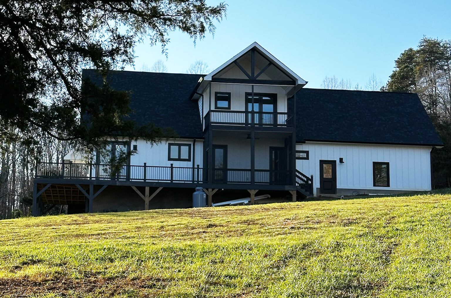 Outdoor living was a priority in the design. The elevated deck, screened porch and balconies offer sweeping views of the surrounding property, creating natural extensions of the indoor living spaces. Whether enjoying morning coffee or hosting friends, these outdoor areas make the home feel connected to the landscape.