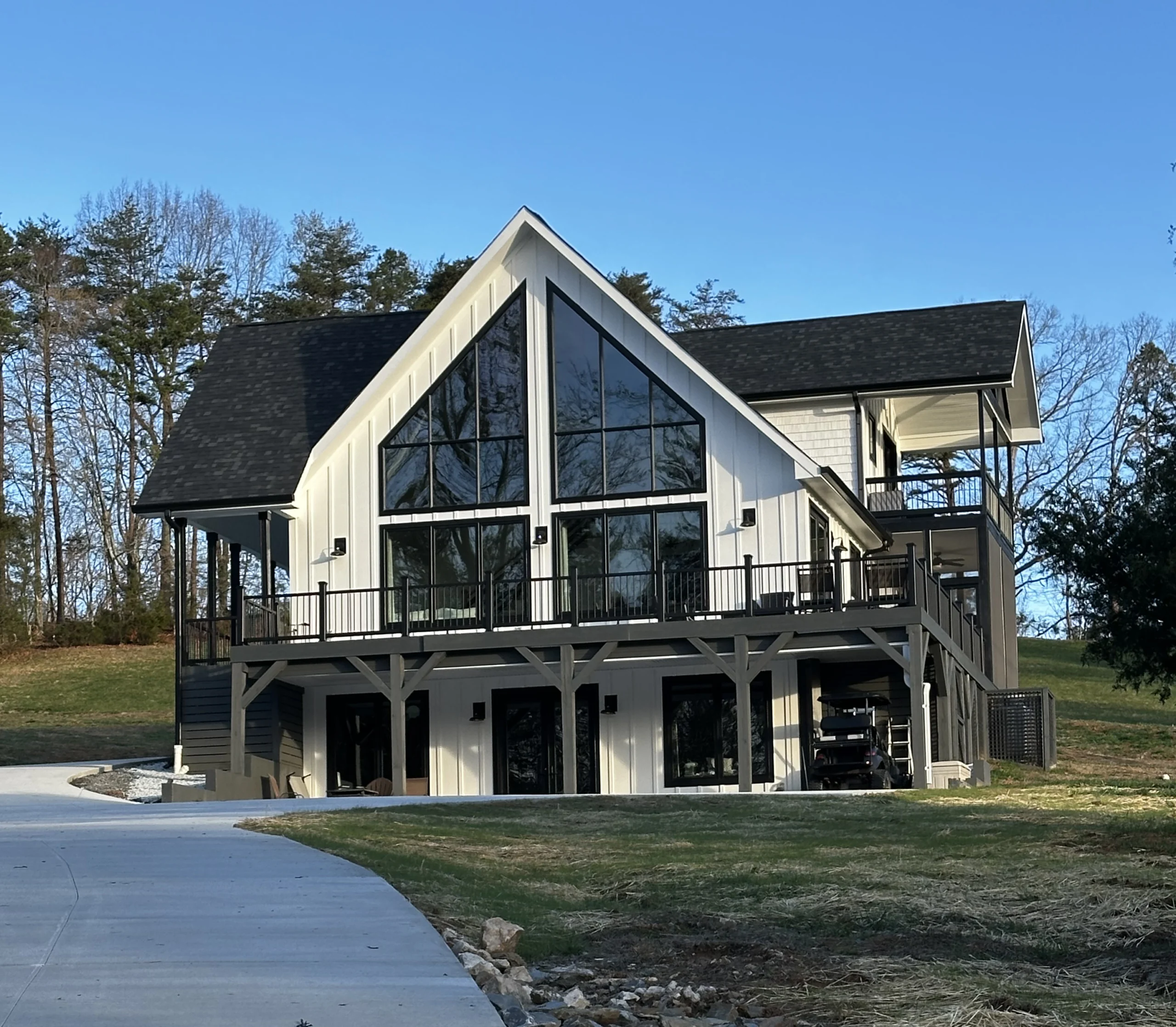 From the outside, the home’s crisp white siding and contrasting dark trim create a timeless yet modern profile. Multiple gables, expansive windows, and carefully balanced rooflines give the home its distinctive character. The large front facing glass panels not only define the architecture but also flood the interior with sunlight throughout the day.