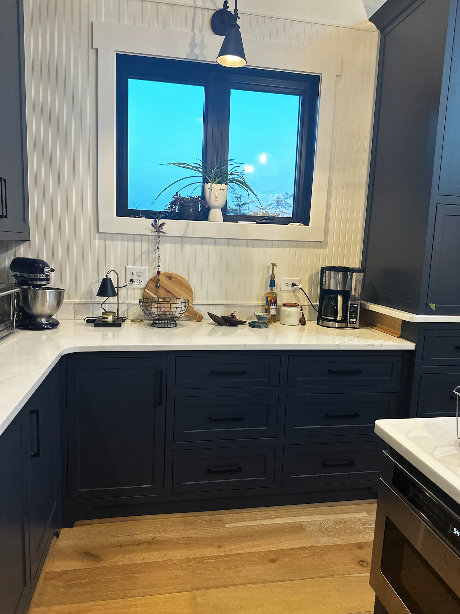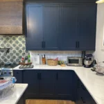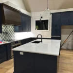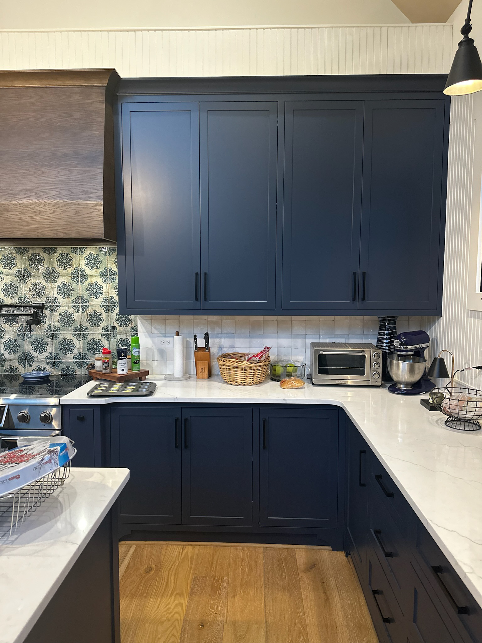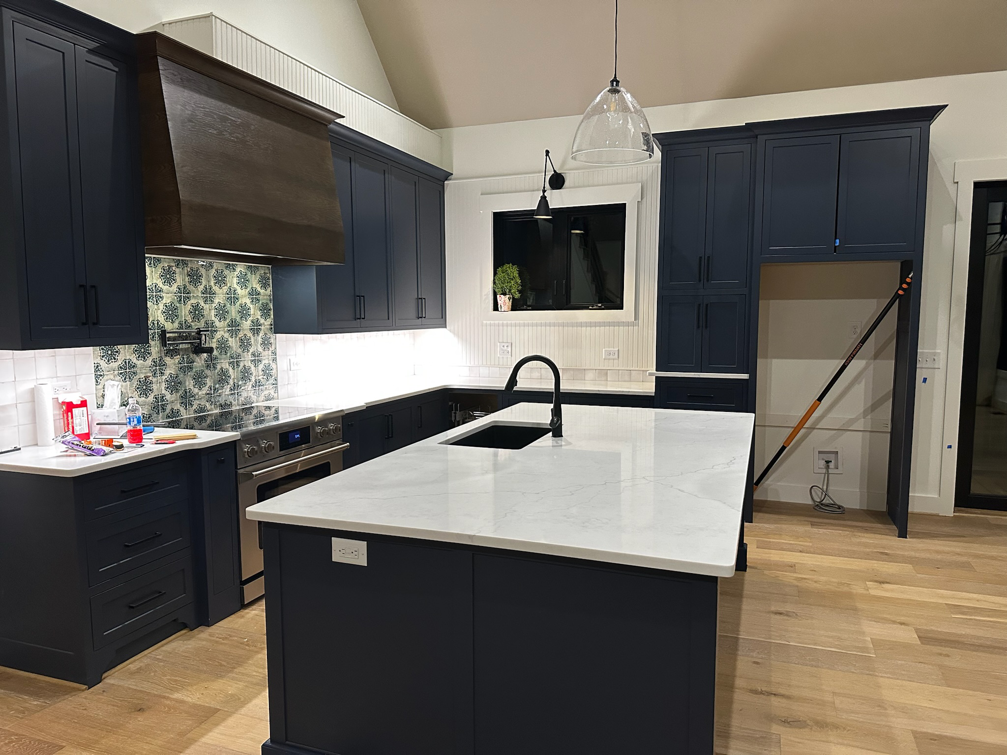 The kitchen is a standout feature, blending bold design with everyday function. Deep navy custom cabinetry grounds the space, while white quartz countertops and a large island provide generous prep and serving areas. A custom wood range hood adds warmth and craftsmanship, and the patterned tile backsplash introduces a touch of artistry and personality.