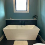 The primary bathroom brings together modern lines and calming color. A freestanding soaking tub sits against a dramatic vertical tile accent wall, paired with a sleek black wall mounted faucet. The frosted window above the tub allows natural light to pour in while maintaining privacy.