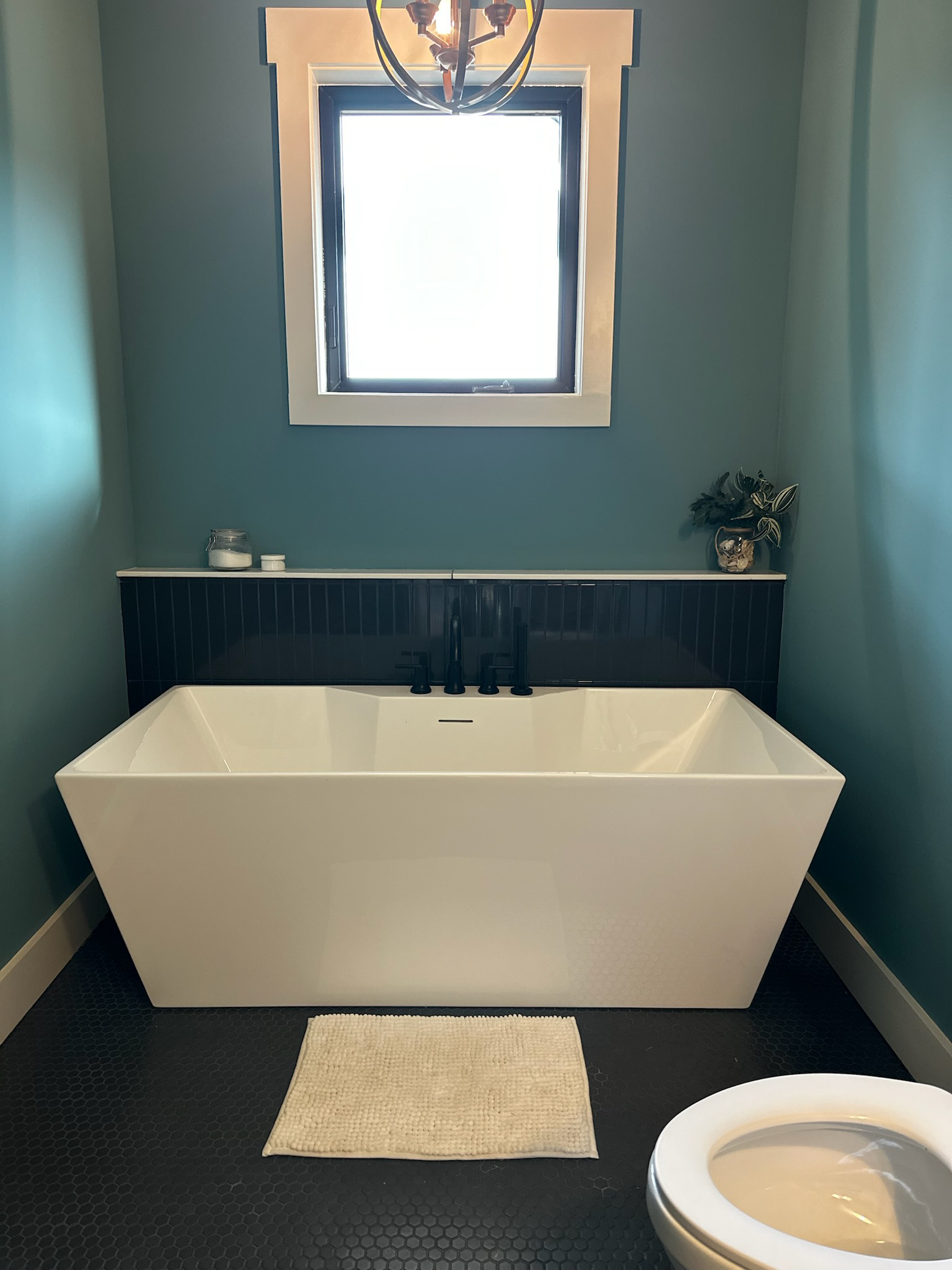 Dark hexagon floor tiles, a soft teal wall color, and warm lighting create a serene, spa inspired atmosphere — the perfect place to unwind at the end of the day.