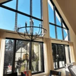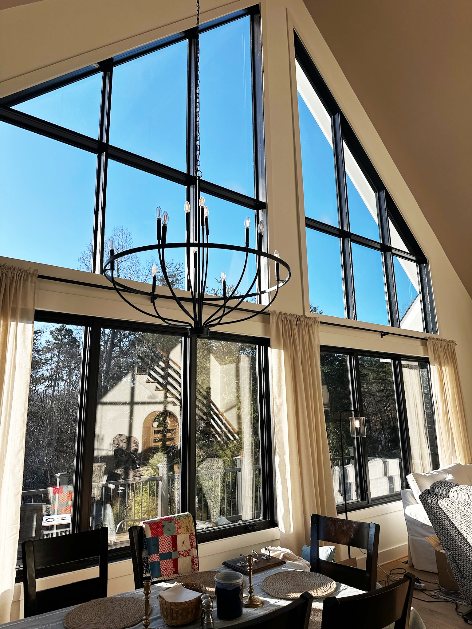 Inside, the home opens into soaring ceilings and dramatic window walls that frame the sky and treetops like artwork. The main living and dining area is anchored by a stunning arrangement of triangular and rectangular windows, creating a bright, airy environment that changes beautifully with the seasons.